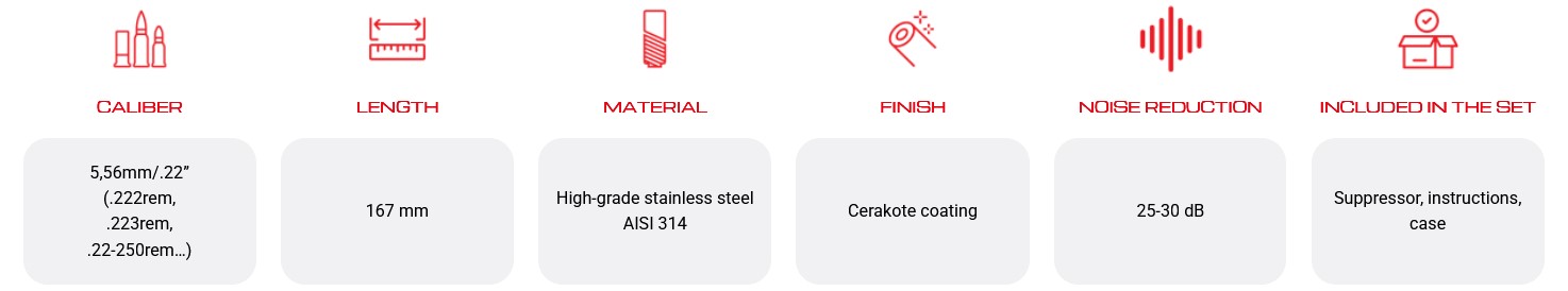 Conçu pour les tirs semi-automatiques à haute cadence, réduction effective du bruit de 25 à 30 dB (en fonction du calibre, de la masse du projectile et de la longueur du canon), sa géométrie interne limite le retour des gaz de combustion vers la culasse. Protection efficace de l’ouïe de l’opérateur, cycle de tir fluide, sans incidents. Construction monobloc en acier inoxydable, résistante aux chocs et aux hautes températures, revêtement céramique pour une protection optimale contre les résidus de poudre.